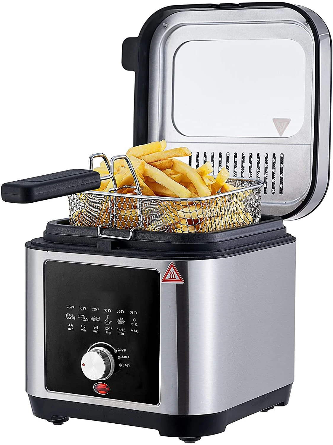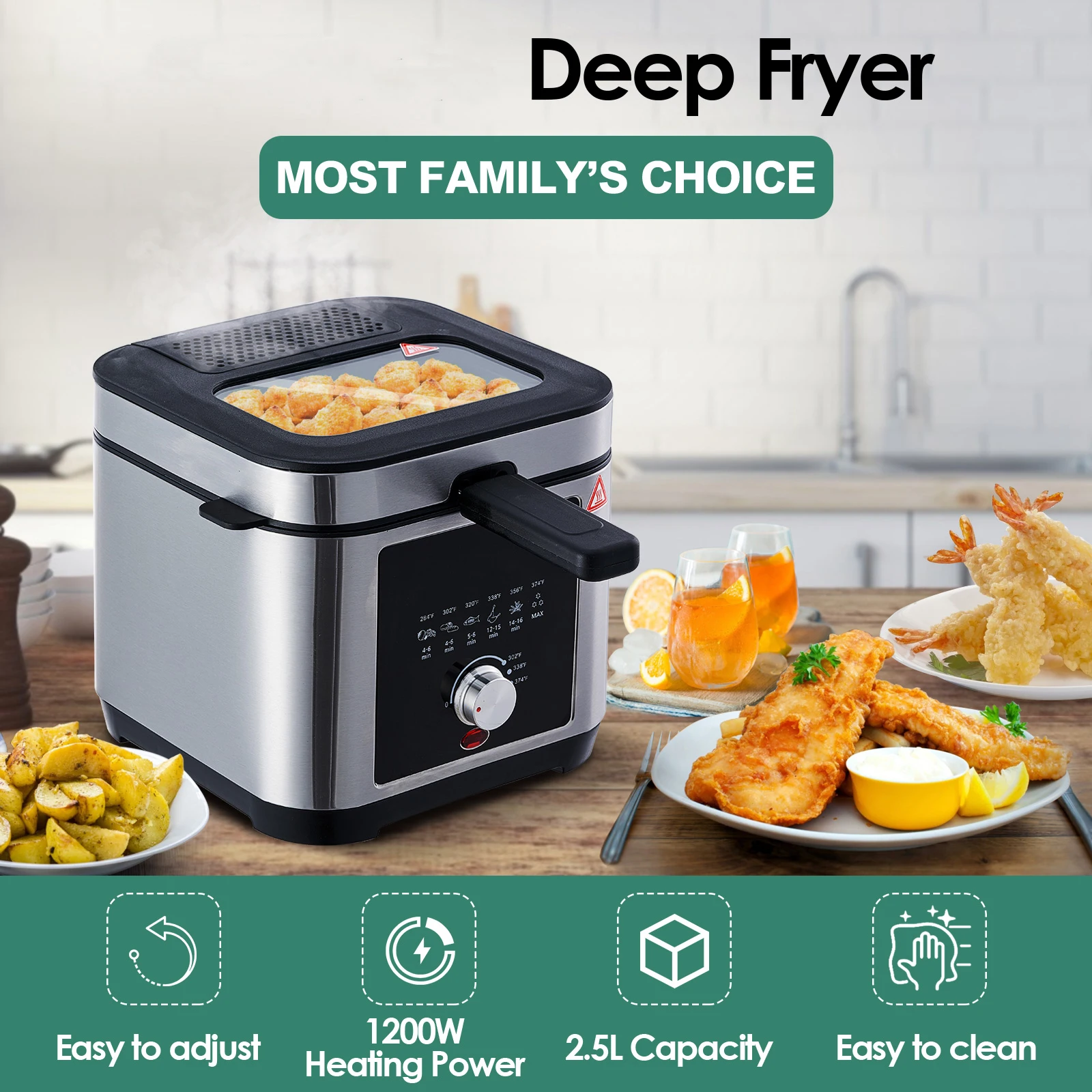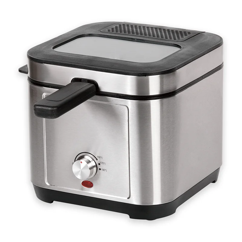 220-240V, 50/60Hz, 1200W Capacity: 2.5L Brushed S/S housing Variable temperature: 150-190℃ Temperature control by thermostatRemovable lid with large window and filter Non stick coated, fixed oil tank with non sitck coating Cool-touch handle Indicatorlight Overheat protection